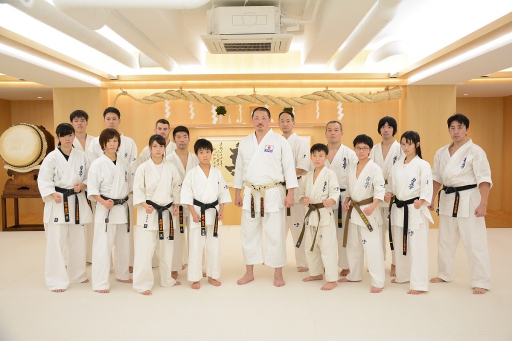 15:00からの松濤館流の林田至史(ちかし)先生の形(型)講習では、軽い準備運動の後の基本稽古では、まず前屈立ちから逆突き、前足を前方にスライドさせて逆突きの3連打、蹴りでは前屈立ちの腰を落とした構えから左右の前蹴り2連打を行った。林田先生からは「自分のやりやすい姿勢で行うのではなく、しっかり腰を落としてやりにくい姿勢から行うことが自分の稽古になります」と注意があった。移動稽古では、追い突き、飛び込んでの追い突き、前蹴りからの追い突き、三本突きが行われた。