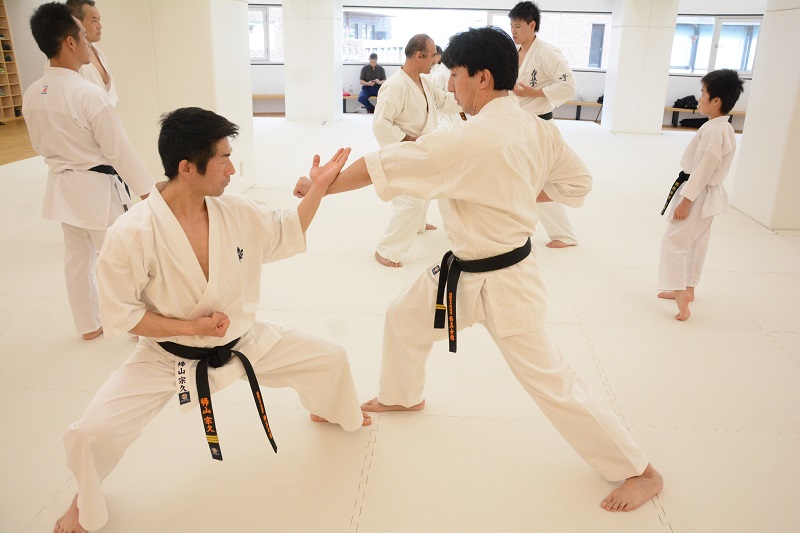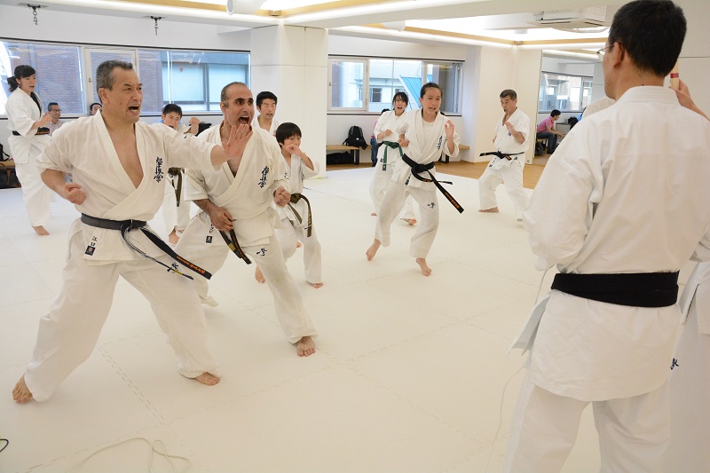 その後、2人組でセイエンチンの分解を最初から通して行い、関根先生からは「相手の裏打ち(裏拳顔面打ち)に対して、まばたきをしないように注意してください。見えている攻撃はかわしたり外したり何らかの対応ができますが、見えていない攻撃は効いてしまうことが多く、組手では相手がまばたきして目をつぶった瞬間を狙うこともあります。また、気合いを入れる時には逆に目を大きく見開いて目の力で相手を圧倒するような迫力を出すほうが審判の印象点が高くなるように思います」との解説があった。