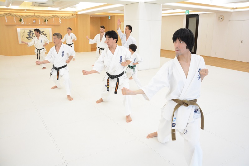 15:00からの形(型)講習は糸東流の関根寛和先生の指導で行われ、今回は前半はバッサイダイ、後半はセイエンチンのそれぞれの部分練習と全体を通した稽古が行われた。関根先生から「百錬自得とは、同じことを何度も繰り返し反復しなければ本当に自分のものにはならないという意味ですが、形は部分練習の反復で体に染み込ませることによってそれが自分の技になります」と話があり、道場の鏡に向かってバッサイダイの部分練習からこの日の稽古がスタートした。相手の攻撃を受けて後方に移動する場面では「逃げるとか、下がるのではなく、相手との間合いを切っていつでも反撃できるイメージを持つこと」との解説があり、他にも「体の軸を最大限に捻る」「踵は床につけたまま浮かせない。審査や試合では減点の対象になる」といった指摘があった。その後、バッサイダイを通して行い、小休止を挟んでセイエンチンの部分練習、最後に通した形を行い、関根先生からは「地味な反復練習を自分でどう意味を持たせるのかによって得るものが違ってきます。形も組手も自分に勝てなければ試合には勝てない。そういった忍耐力も形の稽古で養ってほしい」との話があり、この日の形講習を終えた。