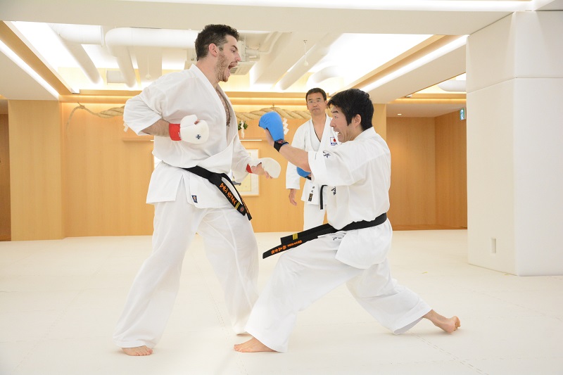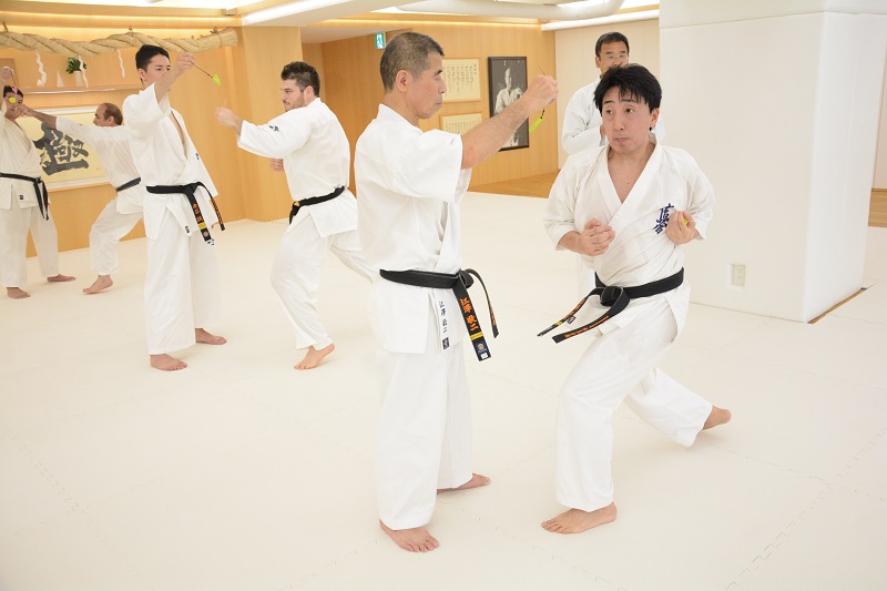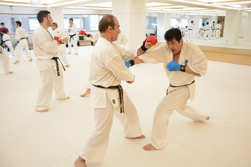 16:00からの組手講習は横道正明先生の指導で、最初に2人組になって手で吊るしたボールを攻撃側が突きで掴んで、即座に引き手を取る稽古が行われた。まず上段刻み突きから始まり、中段逆突き、笛の合図で構えをスイッチさせて刻み突き、同じく逆突きと続けられ、横道先生から「(ボールを取って)手を引いたら、その場で安心せずにすぐに相手との間合いを切って元の位置に戻って構える。前に出るときは、相手に気持ちをぶつけるつもりで瞬間的に踏み込むこと。気合いも技ですから、気迫を込めて、一本一本を大切に突いてください」との指導があった。