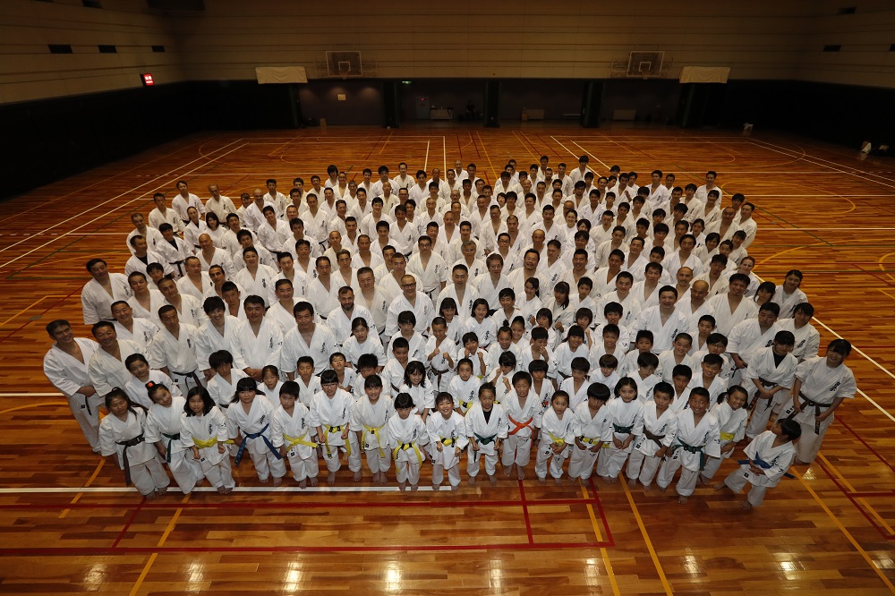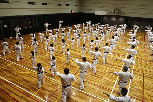 型交流大会閉会後の13時30分より、体育館サブアリーナにて松井館長の指導で型セミナーが行われ、全国支部長をはじめ、各支部の指導員、大会に参加している選手や一般道場生など約230名が参加。最初に松井館長から「型と組手は空手の両輪。大山総裁が言われた“地に沿った基本、理に適った型、華麗なる組手”を目指すためにも、型を疎かにしてはいけません」との話があり、突き蹴りの基本動作、移動稽古や移動の際の立ち方の説明や型の三要素と言われる“技の緩急、力の強弱、息の調整”を意識することの大切さといった、型を行う上で必要となる基本的な説明があり、稽古は準備運動から基本、移動まで約3時間に渡って行われた。