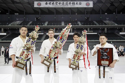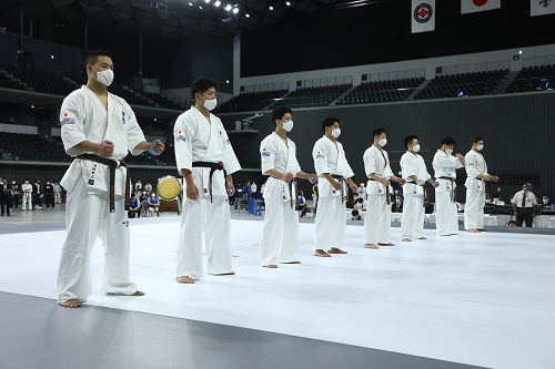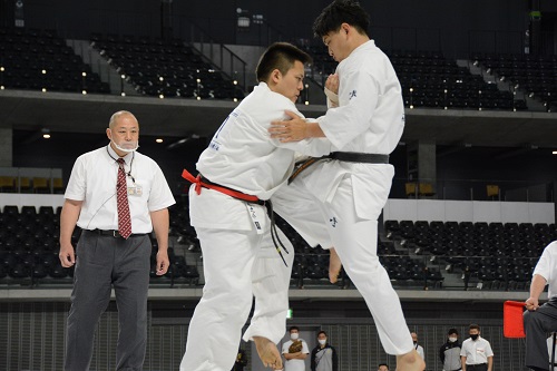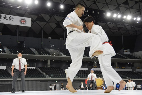 男子は優勝候補でもあった昨年世界大会6位の星龍之介(本部直轄浅草道場)が3回戦で奥寺勇輝(東京城西支部)の上段前蹴りで技有りを取られて敗退する波乱があったが、他は概ね順当に勝ち上がり、西村界人、山川竜馬、小林健人、清水祐貴(4名とも東京城北支部)、加賀健弘、石﨑恋之介、奥寺(3名とも東京城西支部)、そして昨年世界大会5位のコンスタンティン・コバレンコ(総本部道場)の計8名がベスト8のクジを引いた。
