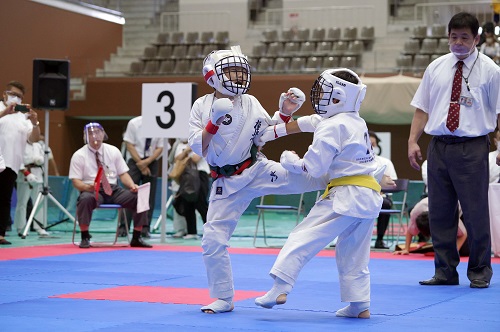 まずセミコンタクト大会は7歳の小学生から50歳以上の壮年まで19カテゴリーに分かれて実施され、顔面への直突きをフェイントにして中段廻し蹴りを繰り出したり、相手の蹴り技にカウンターの直突きを合わせるなど、どの選手も技術的な上達が見られ、これまで以上にレベルの高い、スピード感あふれる攻防が展開された。