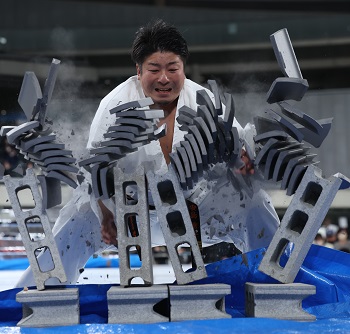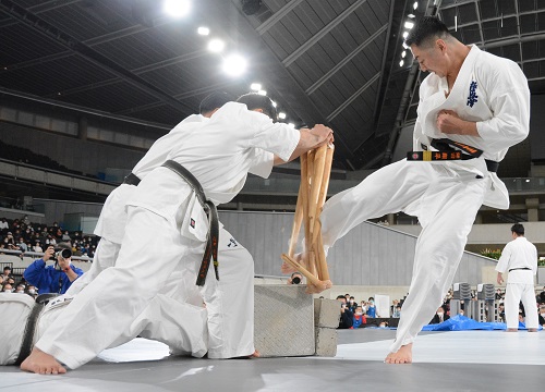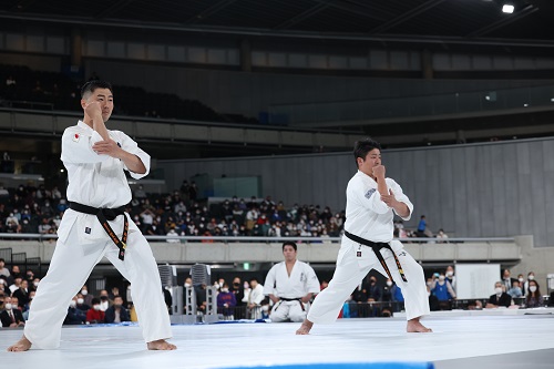 また、今大会では2年前に発足した演武プロジェクトチームによる演武が披露され、第45回全日本チャンピオンの安島喬平支部長(茨城中央支部)と第48回全日本チャンピオンの鎌田翔平支部長(東京城東湾岸支部)による征遠鎮の型とその分解組手、さらに安島支部長が両手瓦10枚割り、後ろ蹴り氷柱割り、鎌田支部長は公式バット6本折り、氷柱手刀割りの試割り演武を行い、観客の大きな拍手を受けた。