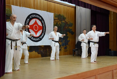 合宿初日はまず参加者全員で大山総裁の記念碑参拝から始まり、続いて松井館長の指導による館長稽古が行われ、準備運動から基本稽古、移動稽古、重心移動の基礎的な動作方法や意識の持ち方など細部にわたって丁寧な解説があった。また、夜の館長講話では「今年は大山総裁生誕100年であり、秋に第13回世界大会を開催する重要な一年である」との話があり、その後の質疑応答では参加者の様々な質問に館長がユーモアを交えて応えるなど和やかなムードの中で貴重な話を聞くことができた。