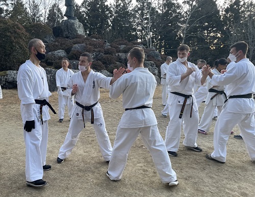 2日目は夜明け前の6時30分より気温マイナス7度の中で早朝稽古が行われ、神社拝殿で祝詞を受け、大山総裁の御霊が祀られている祖霊社を参拝。午後から昇段審査が行われた。3日目は同じく6時30分より早朝稽古、この日は館長の指導で約束組手の稽古が行われ、拝殿で祝詞を受けて三峯神社での稽古を終了。朝食後に三峰山を下山し、途中に流れる清浄の滝で滝浴び修行を行い、今年の冬合宿を締めくくった。