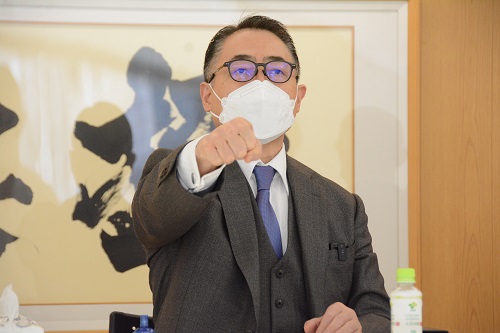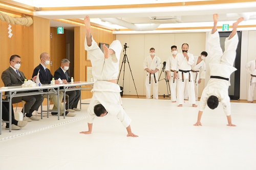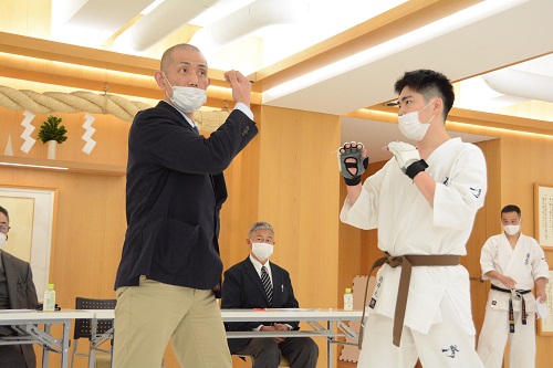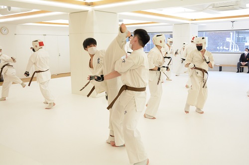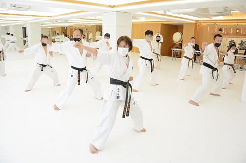 今回の審査会には松井章奎館長、郷田勇三最高顧問、福田勇師範、八巻建志師範、杉村多一郎師範が出席し、1級と初段の計14名が受審。感染防止対策のため、当日の検温、手指の消毒・除菌、室内の換気、マスク着用等を徹底し、午前11時から審査がスタートした。