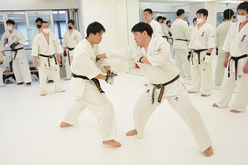 参加選手は世界大会代表の西村界人、コバレンコ・コンスタンティン、大秦稜司、加賀健弘、清水祐貴、石﨑恋之介、鵜沢菜南、佐藤七海、知念琉花、山﨑乙乃、他に代表候補選手数名を含む約50名。稽古は、13時より赤石監督の号令で準備運動、基本稽古から始まり、続いて審判審議委員の進裕治支部長からルールの新たな微調整部分である防御技術の重要性や胸が合った状態・腕が合った状態の反則についての説明や諸注意があり、13時30分より本戦3分のみの試合形式の組手が行われ、各組手で判定を取り勝敗が付けられた。