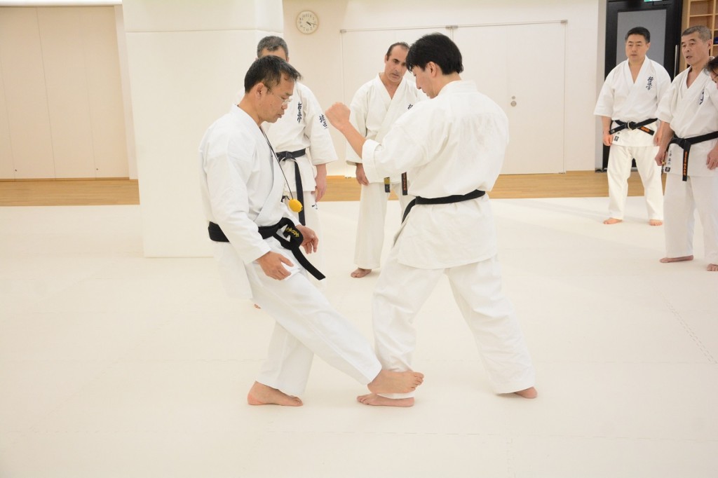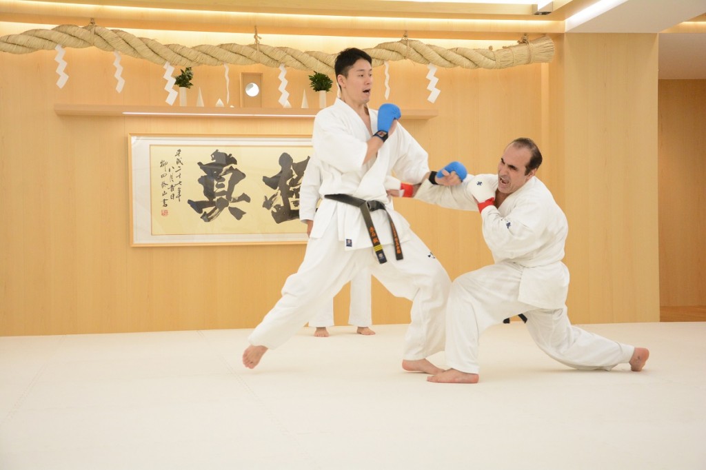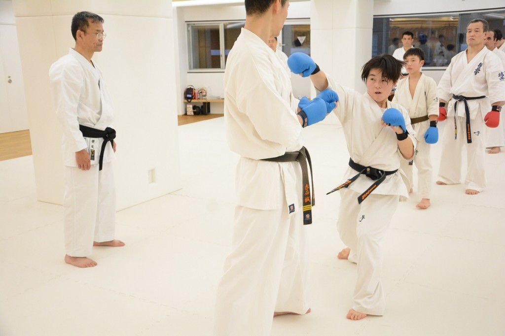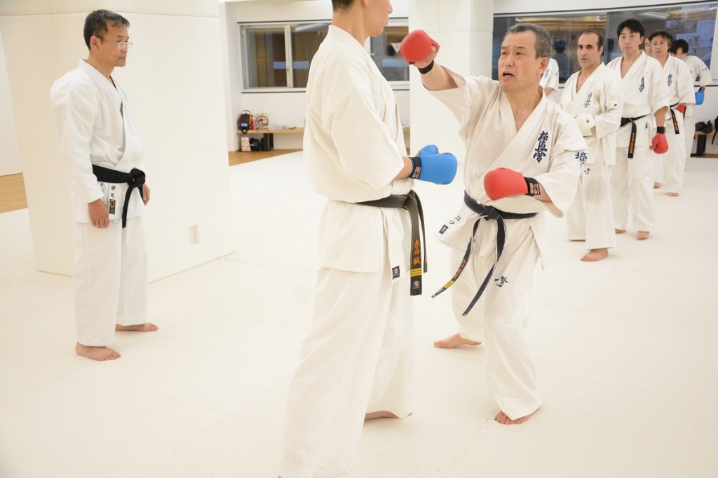この日は16:00から横道正明先生の組手講習が実施され、まず最初に組手立ちからの刻み突き、逆突き、刻み逆突き、追い突き逆突きの移動稽古が行われた。横道先生は「後ろ足で床を蹴る力を使って素早く前に踏み込む。前に出て止まってから突きを出すのではなく、必ず前に出ながら突くこと。動きが止まるとその瞬間に必ずカウンターをもらいます」と注意があった。
