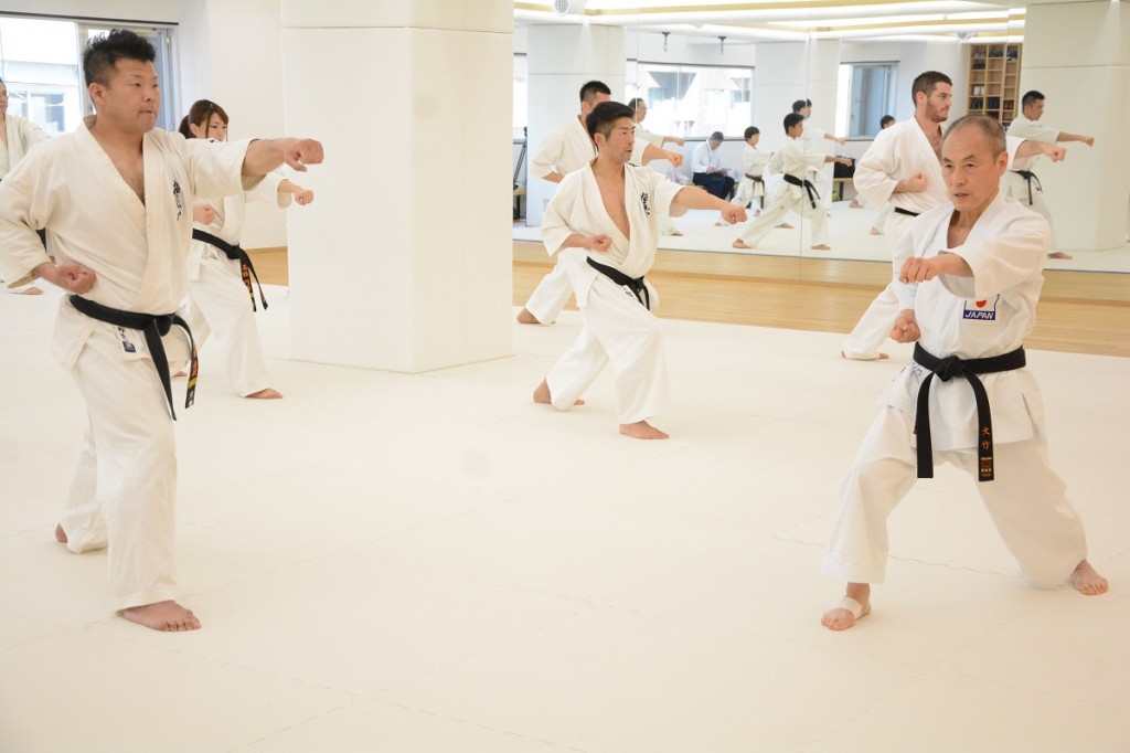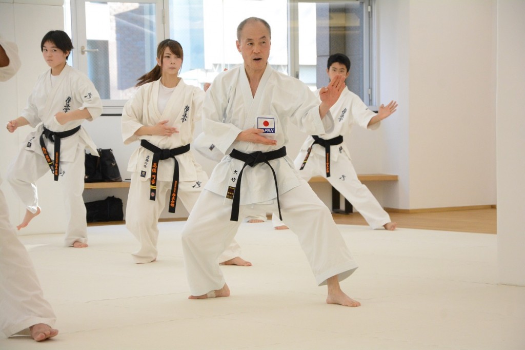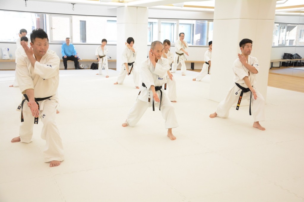 15:00からの形(型)講習は、この日は松濤館流の大竹則雄先生の指導が行われた。まず軽い準備運動から始まり、基本稽古では中段突き、前蹴り、前屈立ちで刻み突きから逆突きの二本突きが行われ、大竹先生は「松濤館流では半身と正面の使い分けを大事にしていて、形の試合の中でもそれが出来なければ減点の対象になります」と話され、刻み突きでは半身、逆突きでは正面を向くという姿勢が徹底された。また、前屈立ちからの前蹴りでは「稽古の中で体を練り上げていくという考えがある」(大竹先生)ということから、腰を落とした低い姿勢から膝のスナップを効かせて蹴る動作が指導された。