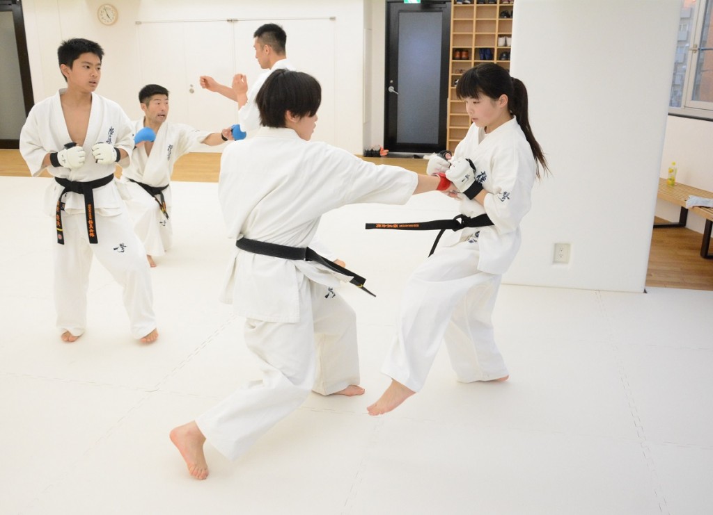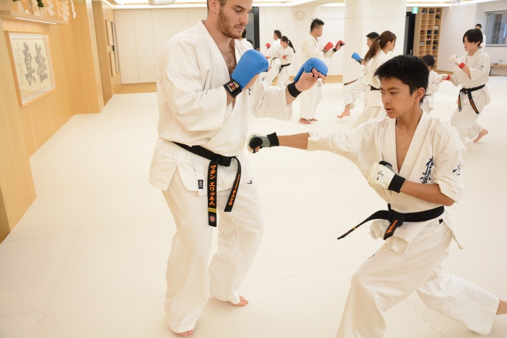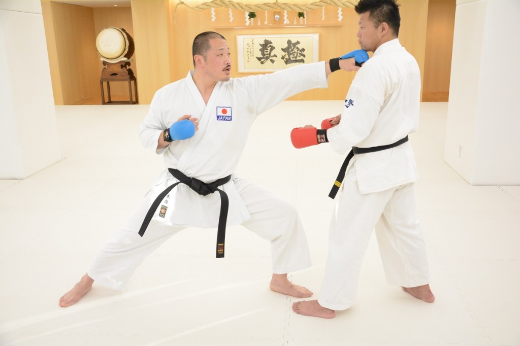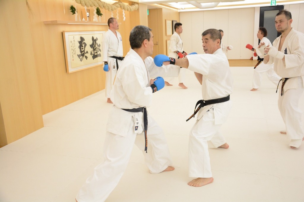 続いて16:00からの組手講習は、今回は土佐樹誉彦先生が指導がされ、まず二人組の打ち込み稽古で、刻み突き、逆突き、刻み逆突き、刻み逆突きから相手が下がったところに追い突き、前足で相手の前足にタッチしてから刻み突き、前足の中段前蹴りから刻み突きの稽古が行われた。さらに下段から上段、中段から上段に蹴りを変化させるフェイント技、相手を次々に変えていく回り稽古、二人組で前足をスライドさせて腰を落として同時に中段を突く稽古や相手の突き技に対してカウンターの逆突きが指導された。