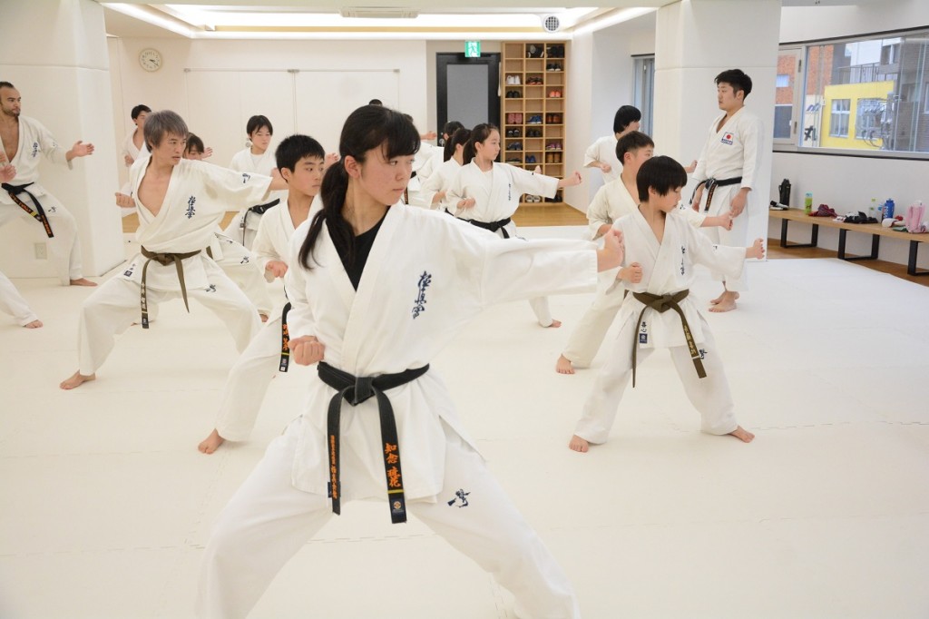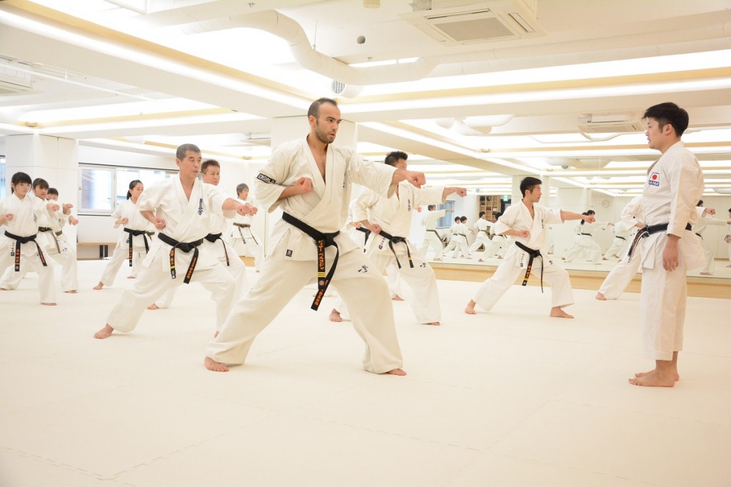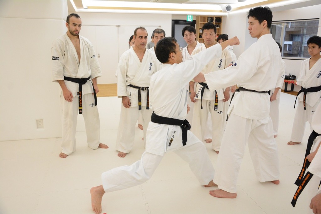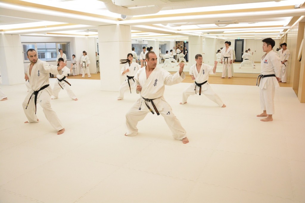 最後は試合形式の組手となり、2015年第11回世界大会準優勝者で現在代官山道場で指導員研修中のジマ・ベルコジャを含む講習生がそれぞれ組手稽古を行った。先生からは「攻撃が当たる間合いになったら迷いなく仕掛けてください。試合の中でチャンスはそうあるものではないので、今がチャンスだと思ったら積極的に攻撃すること。試合で判定になった場合は積極的に技を仕掛けている方に旗が上がります」との話があり、この日の講習会は終了した。