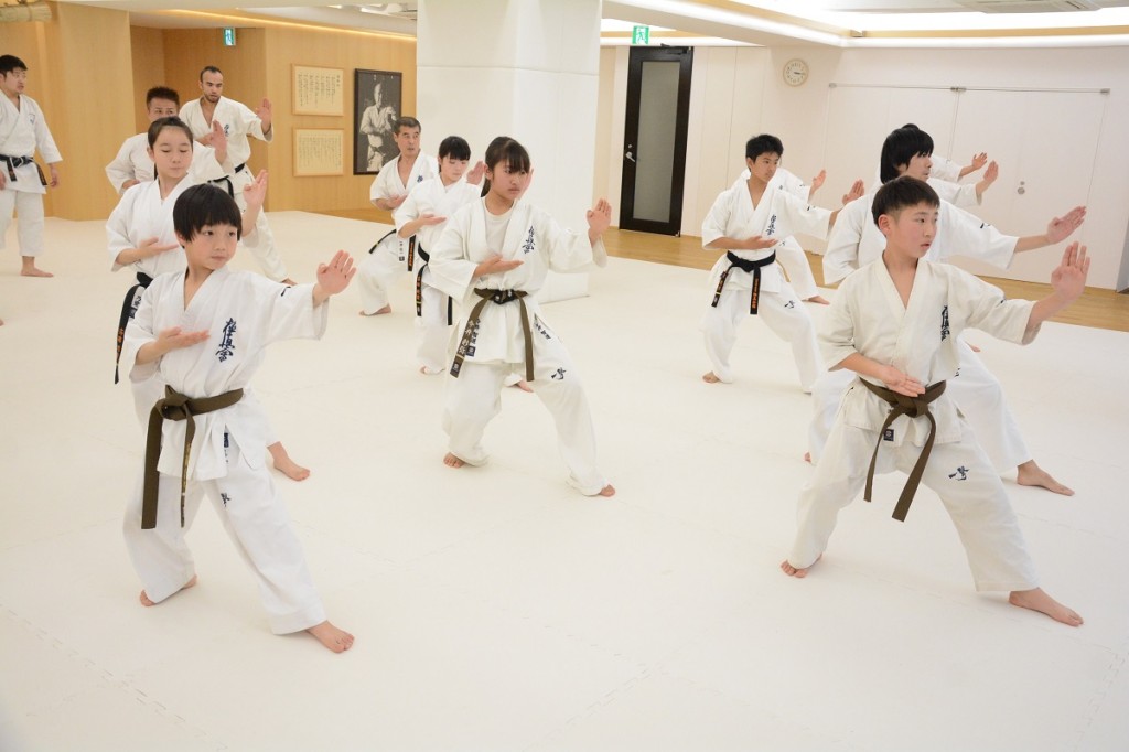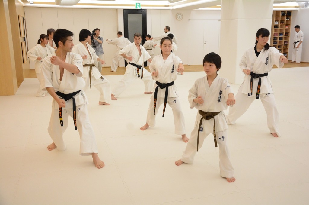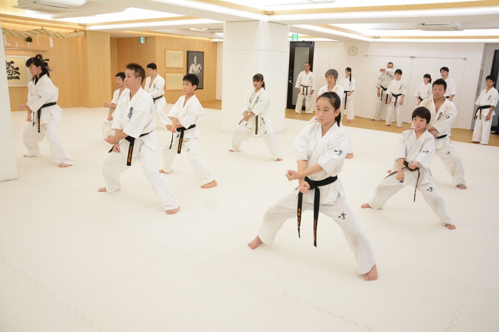 15:00から松濤館流・林田至史(ちかし)先生の形(型)講習では、軽い準備運動の後の基本稽古で前屈立ちから逆突き、前蹴り、移動稽古では前屈立ちからの追い突き、上段受けから逆突き、前蹴りから追い突き、後屈立ち手刀受け、横蹴りの稽古が行われた。