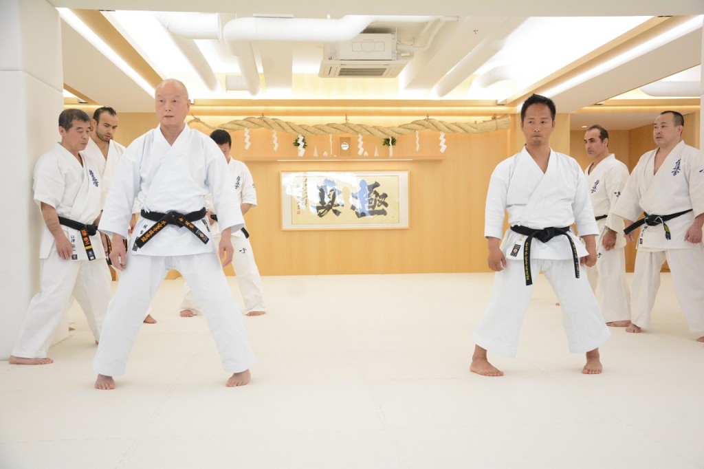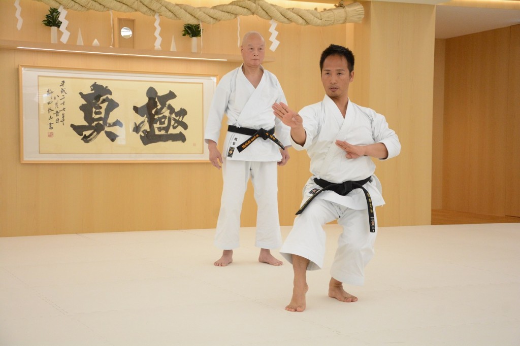 15:00からは今回より糸東流の形(型)講習が始まり、坂梨孝美先生が指導、関根寛和先生が指導補佐にあたった。「形の基本は立ち方」という坂梨先生の指導の下、形に出てくる様々な種類の立ち方によって前後左右に移動する稽古を行い、続いてその立ち方をベースにした基本形・平安二段を関根先生が披露した。