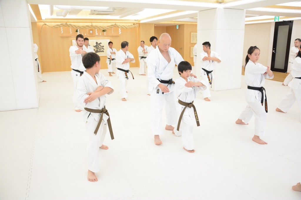 続いて本格的に形の稽古となり、糸東流の第一指定形であるバッサイダイ、セイエンチンの講習が行われた。その中で坂梨先生からは「回転する際に松濤館流はカカトを軸にすると習ったと思いますが、糸東流は上足底を軸に回転します」「糸東流の交差立ちは前足の膝の後ろに後ろ足の膝を付けます」等の注意があった。講習の最後に先生は「形は動きの中で正しい立ち方が出来ているかどうかが重要。スピードや緩急は稽古していく中で自分なりに磨いていきますが、その基本となるのは立ち方です。その基本をしっかり覚えるためにも最初に行った様々な種類の立ち方で移動する稽古は大事になってきます」と解説されて、第1回目の講習会を終えた。
