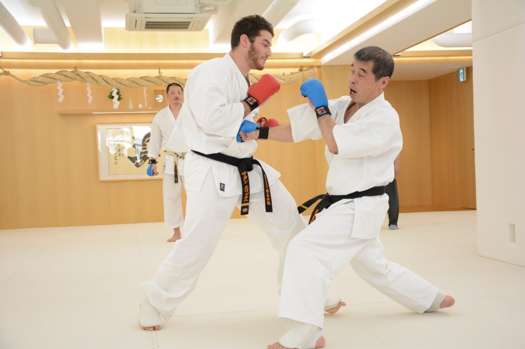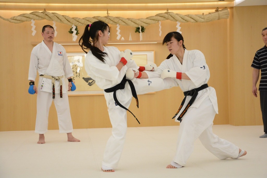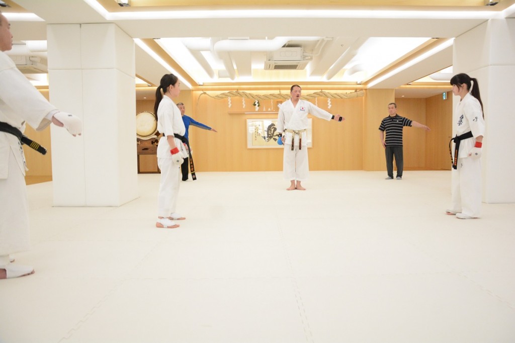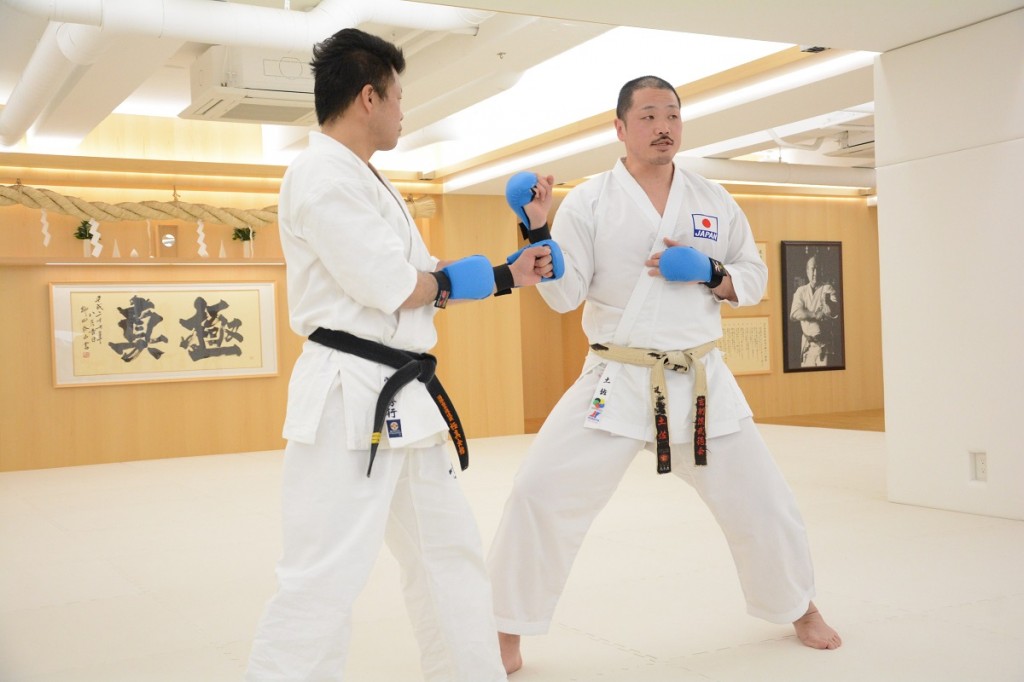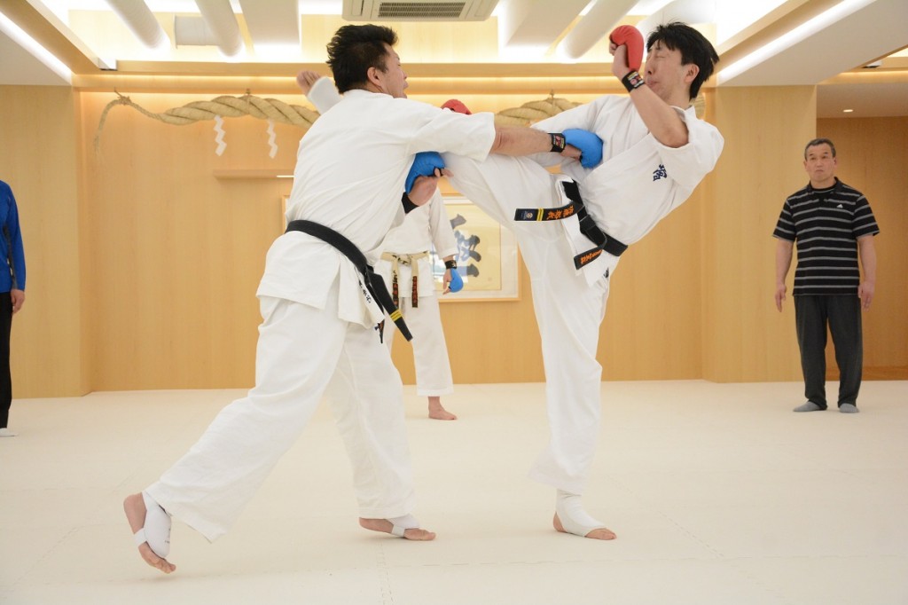 16:00からの組手講習は土佐誉樹彦先生の指導の下、最初から試合形式の組手が行われ、その際に審判の講習も実施し、どういった技が有効か、また反則になるのかを審判の目からも学んでいこうということで主審は土佐先生、講習会に参加している支部長が4名の副審を務めた。組手の中で全空連ルールの細かい注意点やポイントの取り方など、土佐先生から説明があり、特に「組手では相手に攻撃を当てさせず、自分の技を正確に当てることが大事です。構えも正面向きだと的が大きくなるので、なるべく半身に構えたほうが相手は攻撃を当てにくくなり、自分が前に出るスピードも速くなります。極真の組手でも同じだと思いますが、重要なのは相手との間合いを意識すること。慣れてきたら、一発の攻撃だけではなく連携技や攻撃を出した後に引き手をしっかり引いて残心を意識して下さい」との指導があった。最後は土佐先生も含めた連続組手の稽古が行われてこの日の講習会は終了した。